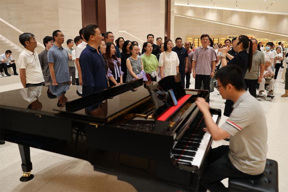 参观结束前,在戴宗祥同志钢琴伴奏下,中国音协全体党员职工合唱了《没有共产党就没有新中国》《游击队之歌》,朱为中、张行彬同志演唱了《松花江上》,大家用歌声缅怀革命先烈,颂扬伟大的中国共产党、颂扬伟大的抗战精神。红色的旋律、高昂的歌声引起在场观众的强烈共鸣,赢得一阵阵热烈的掌声。