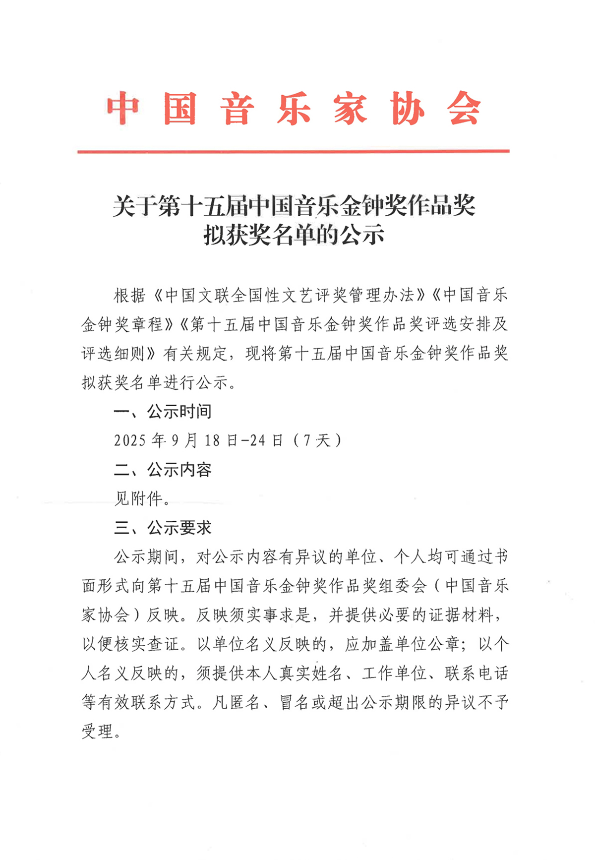 关于第十五届中国音乐金钟奖作品奖拟获奖名单的公示