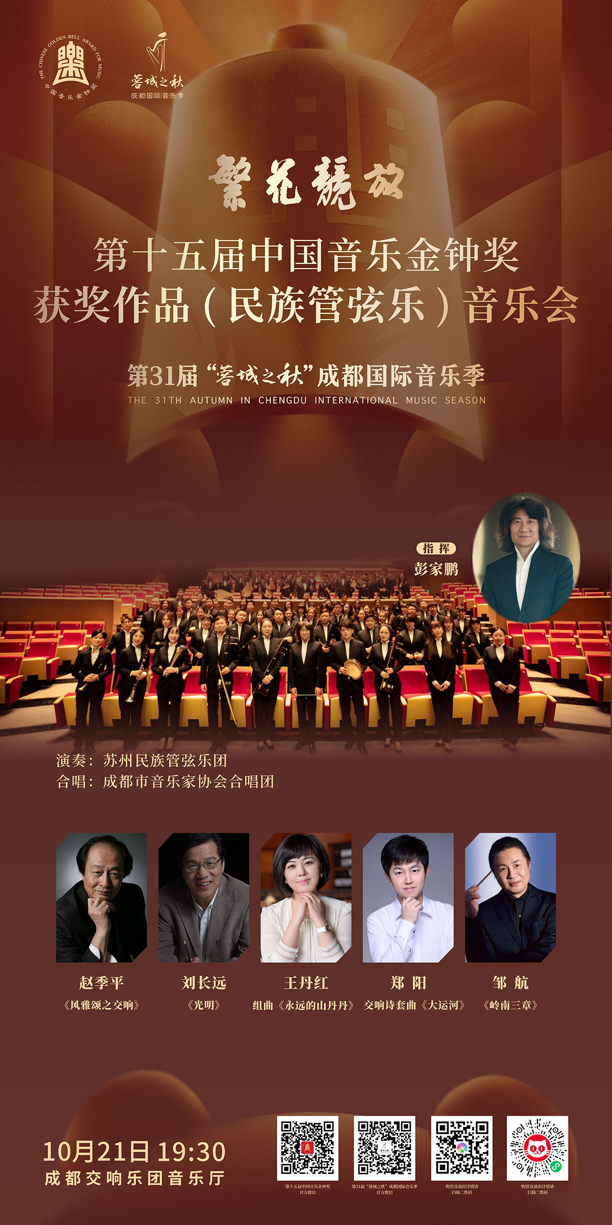 10月21日晚,繁花竞放——第十五届中国音乐金钟奖获奖作品(民族管弦乐)音乐会,在成都交响乐团音乐厅隆重上演。本场音乐会以顶尖阵容演绎五部金钟奖获奖佳作,指挥家彭家鹏执棒,带领苏州民族管弦乐团与成都市音乐家协会合唱团,为现场观众带来一场兼具艺术性与文化底蕴的听觉盛宴,也为成都的秋夜注入浓郁的音乐氛围。