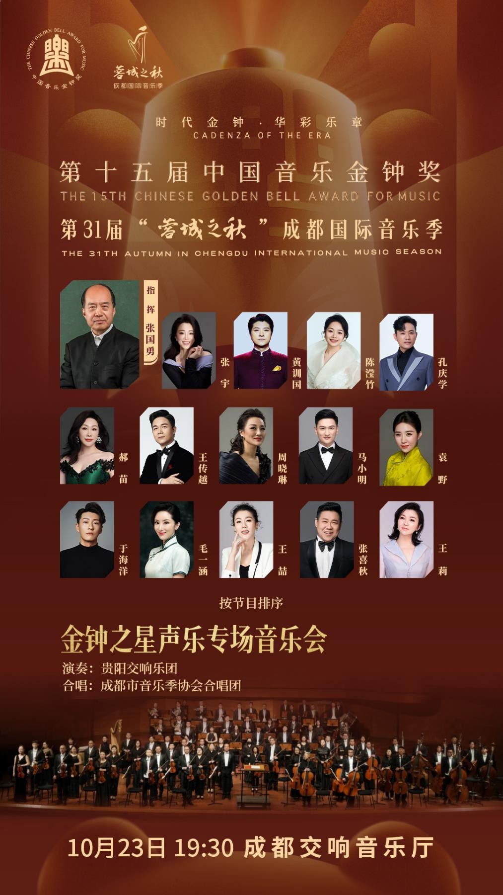 10月23日晚,第十五届中国音乐金钟奖金钟之星声乐专场音乐会,在成都交响乐团音乐厅精彩上演。这场汇聚国内顶尖声乐力量的盛会,由指挥家、中国音协副主席张国勇执棒贵阳交响乐团,携手多位金钟奖获奖歌唱家,以及成都市音乐家协会合唱团,为蓉城观众呈现了一场兼具艺术深度与情感共鸣的声乐盛宴。作曲家、北京电影学院教授舒楠担任音乐会艺术总监,作曲家、中国歌剧舞剧院副院长赵麟担纲总导演,成都交响乐团团长肖鹰担任执行导演。
